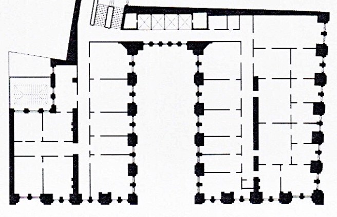 Jenney, Home Insurance Building. Above: Section of the piers in the lightcourt (elevator core). Note that this drawing shows that the piers and spandrels had the same detailing as the exterior piers, i.e., cast iron lintel panels supporting the spandrel’s masonry. The only difference is that the masonry covering the iron section is only 4” thick because it is not subject to the building code because it is not in the exterior perimeter of the building. (Tallmadge, Field Report); Below: Plan of elevator core. Note the plan shows this exact cross-section in each of the piers. (Art Institute of Chicago)