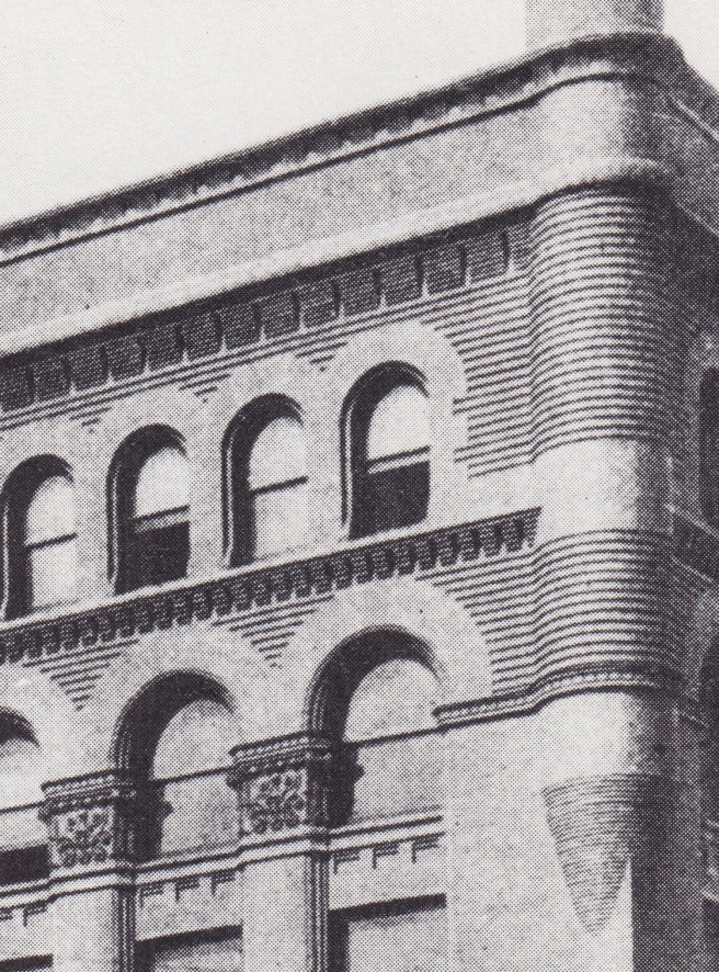 Such tight conditions provided quite a challenge to John J. Flanders, the architect chosen by Mallers to design the building. Most likely utilizing a party wall contract, Flanders used the two existing party walls for support. Along the two street fronts he placed large masonry piers to support the floor girders of the interior iron frame. He chose to emphasize the corner pier not only by increasing its size to accommodate each floor’s safety vaults, but also by giving it a rounded profile. In order to gain as much rentable floor area as possible, Flanders not only pushed the glazing out as far as possible to be flush with the exterior face of the masonry piers, but also cantilevered a bay window that extended continuously for eight stories in floors 2-9 on each street front. These were supported by an iron framework connected to the masonry piers and clad with terra cotta.