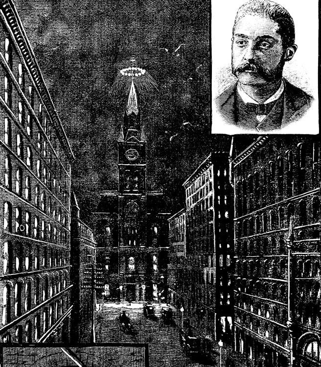 Board of Trade. Sperry’s Corona at Night. The Rookery is at the left, the Insurance Exchange at the right. (Chicago Graphic News)