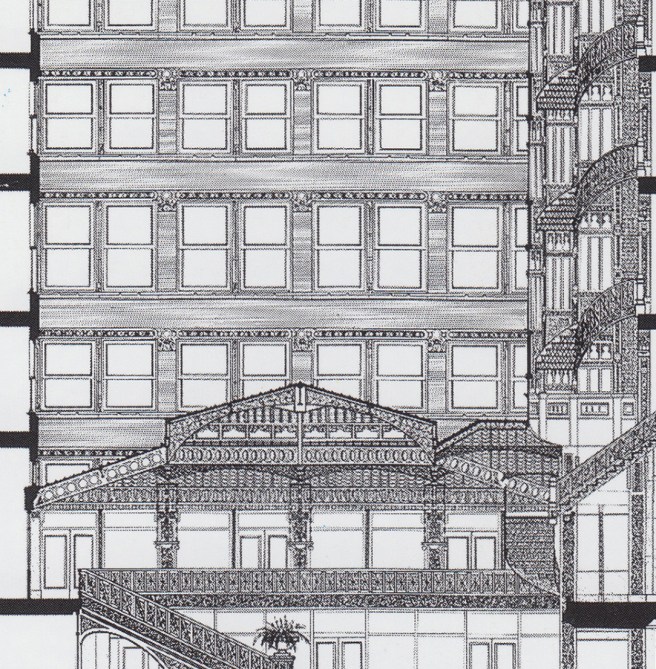 Coming through the aperture of the Rookery’s elevator lobby, Root enticed you to come up, through the skylight and into the lightcourt itself, in order to view this new architectural language. One was presented by Root’s unconscious prophesy of what a skyscraper’s exterior in the immediate future would look like: thin, lightweight, rectilinear, light-colored and clean, and somewhat released from the tyranny of gravity: free from having to be vertically connected to the ground. (One only had to wait five years for it to appear on the Reliance Building.) The contrast between the exterior’s elevations and those of the atrium not only must have been startling, it was also profound. Root had not only changed construction history with the Rookery; he had also designed a history lesson for later generations to appreciate the radical differences between the two structural systems. The chrysalis of the skyscraper had emerged within the protective confines of its protective masonry cocoon, for Bogardus’ iron skeleton frame of the shot towers had finally reappeared in the exterior of a tall building. The lightcourt in the Rookery could be described as taking a department store with a skeletal structure, such as Shillito’s in Cincinnati, and enclosing its multistory atrium at every floor with Bogardus’s technique of supporting brick panels that he had first used thirty years earlier in the McCollough Shot Tower. In fact, Root had even inserted such a form within the lightcourt that housed his by now characteristic cantilevered oriel stair tower. It would take a few more years before this non-romantic elevational expression would make its first appearance on the public exterior of a building, yet one cannot dispute that Root’s atrium walls was its first showcase. Unknowingly (perhaps?), Root had devised a very thorough monument to the history of the iron skeleton frame.