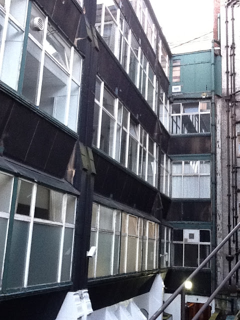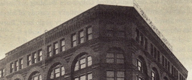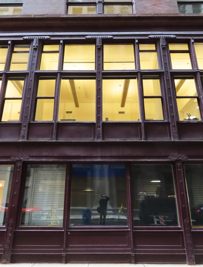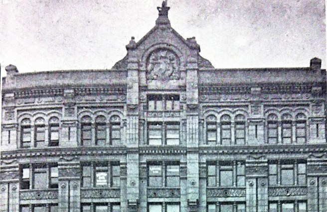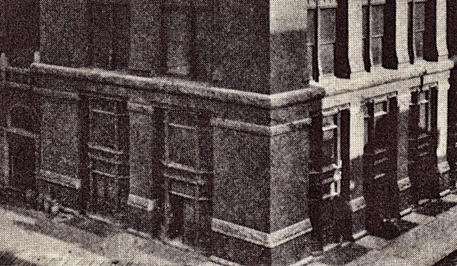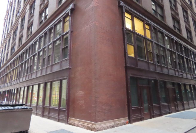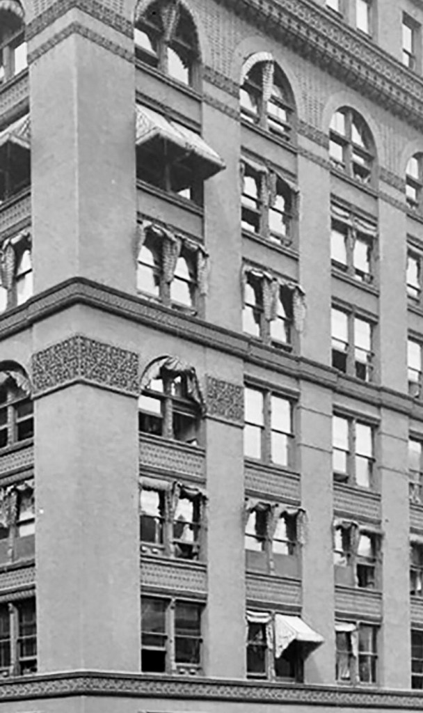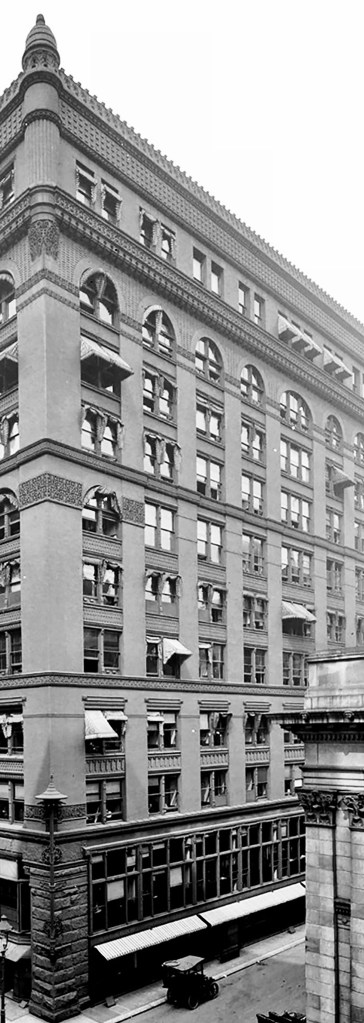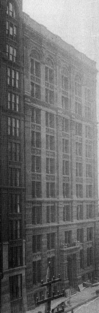 There is a postscript I would like to add. The Luxfer prism company had a showroom on the lower floors at the rear of the building. Some of their products are still in place and visible on the east elevation. Luxfer prisms were designed to reflect daylight back up to the ceiling to project daylight deeper into an office space. Before the onset of sufficient electric light, these were installed in the upper reaches of windows and door transoms.
