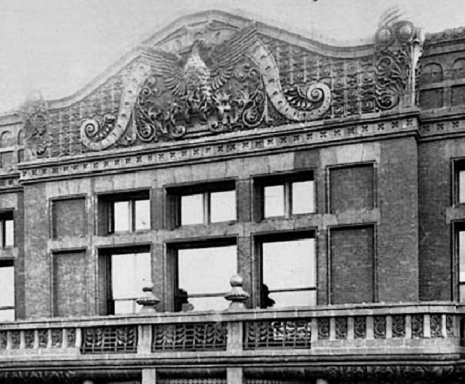 Because both functions of the building, showroom and factory, required a maximum of daylight, especially considering its 170′ depth, Beman’s objective in the design of the front elevation was to open up the wall for as much glass as physically feasible. The first two stories, which contained the show floors, were detailed as a base in red granite, while the upper six floors in which the assembly operations took place, were faced with a light gray Bedford granite. The ground floor, appropriately, was almost entirely sheathed in glass, the better to entice a prospective buyer into the showroom on the first floor. Huge plates of glass filled the three central bays which were flanked on both sides by a granite arch in the end bays: the left one likewise was filled in with glass as a display window, while the right one provided an entry way to drive one’s new purchase off the showroom floor. (If the Home Insurance Building that was finished and open for business by this date, had actually incorporated iron skeleton framing in its exterior, as was claimed by later historians, I must speculate why Beman, who himself had a fair amount of experience with iron framing, did not use iron framing in the Studebaker’s Michigan Avenue façade? My answer is simply that true iron framing was not used in the Home Insurance Building, and in fact, its use was still six to eight months in the future.)