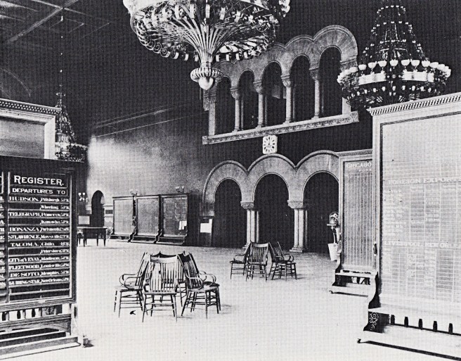 Stairs at both sides joined overhead in a balcony that beckoned a visitor up to the entresol. Flanking the stairs going up were vomitoria that led to the basement where the vaults of the Central Safety Deposit Company were located, space for which had been gained by Root’s new foundations. But here the similarities between his two designs diverged: where the Phoenix was “a one-liner,” i.e., you walked into the lobby and saw the bank of moving elevators backlit by the ten-story wall of glass, in the Rookery Root concealed the climax of the sequence from the lobby with the mezzanine he had projected into the lobby, enticing the visitor to explore what they would encounter next in the Rookery.
