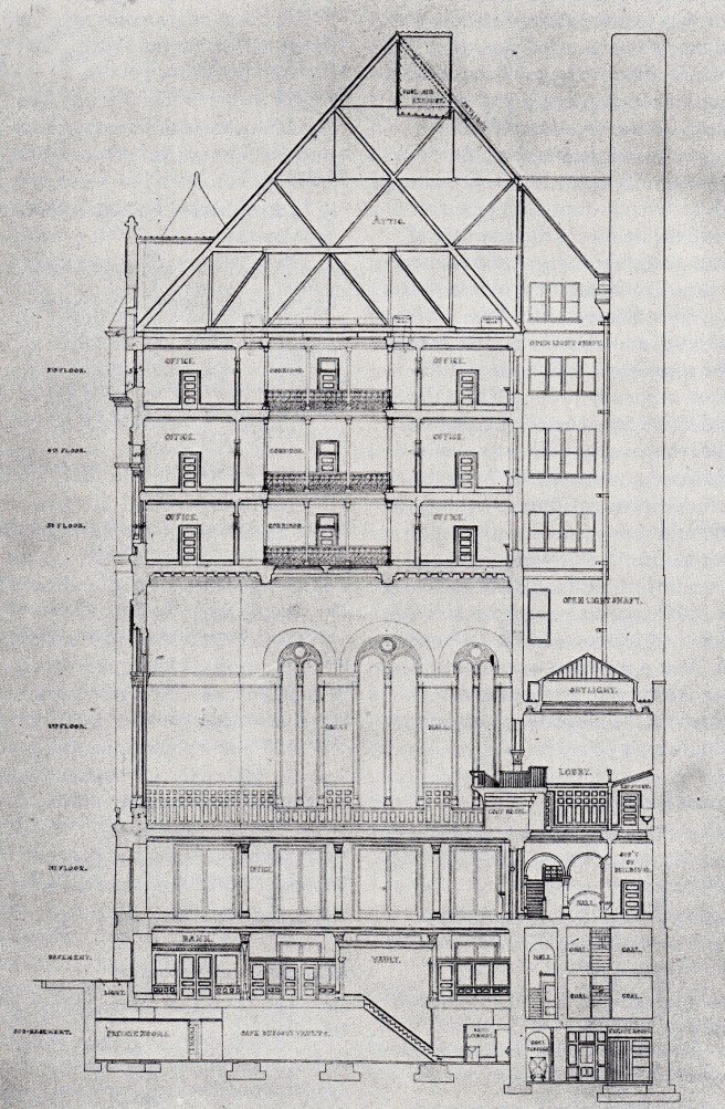 George B. Post, Produce Exchange, New York, 1880. (Online) Below Right: Transverse section. (Landau, George B. Post)