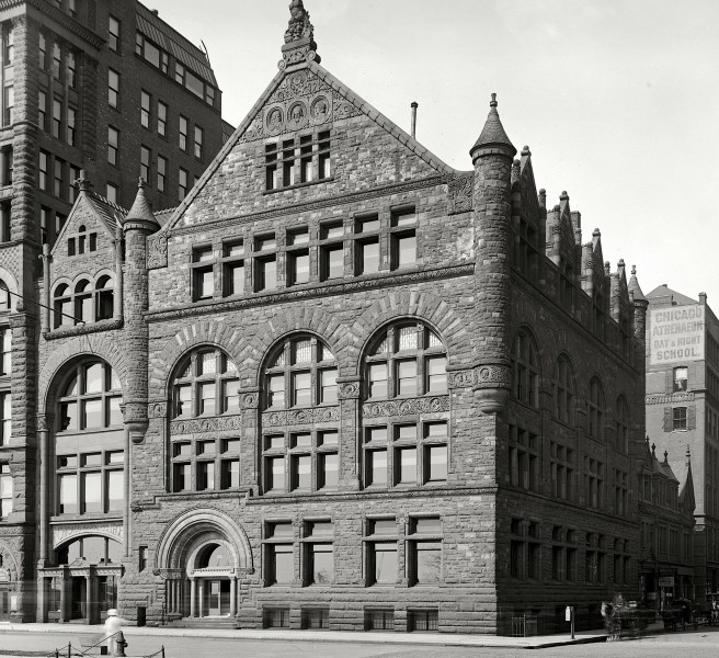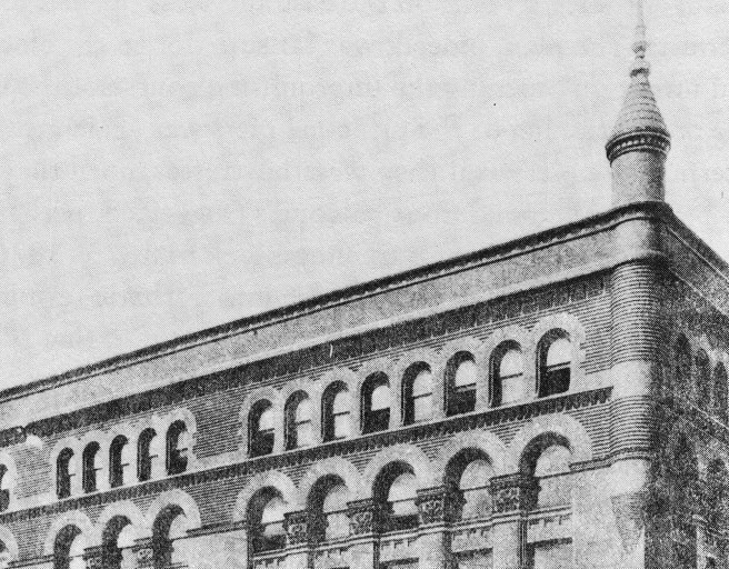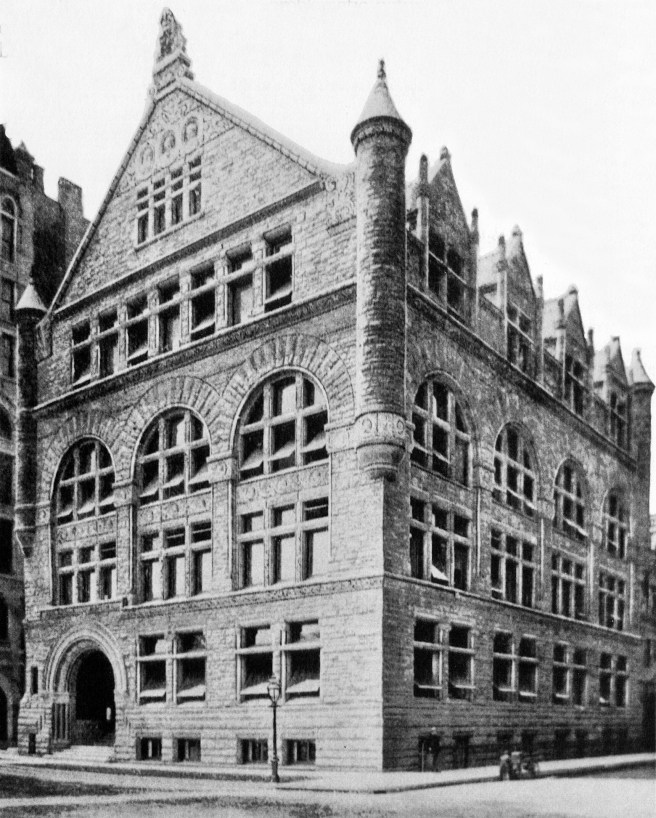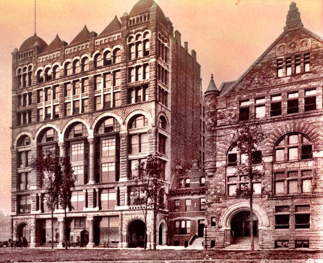 (?) Burnham & Root, 1882 Art Institute of Chicago Building, Van Buren between Michigan and Wabash, 1882. This image is from an enhanced photo of the 1885 building (far left). The 1882 building was not demolished when the 1885 “addition” was erected, therefore I believe this image is the 1882 bulding. (Chicagology.com)
