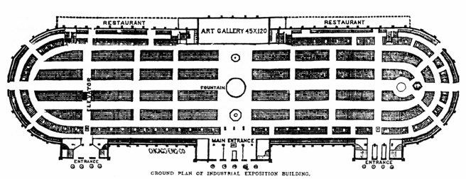 W.W. Boyington, Inter-state Industrial Exposition Building. Ground floor plan. Note the Art Gallery located in the center of the lakefront side. (Siry, Auditorium)