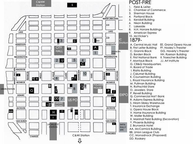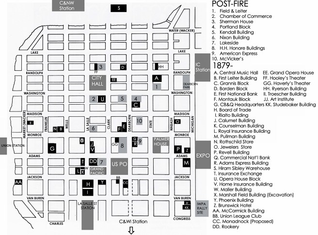View of Chicago, showing the Rookery and the location of Burnham & Root’s office. Their Phoenix Building stood only a half block to the south. (Bluestone, Constructing Chicago)