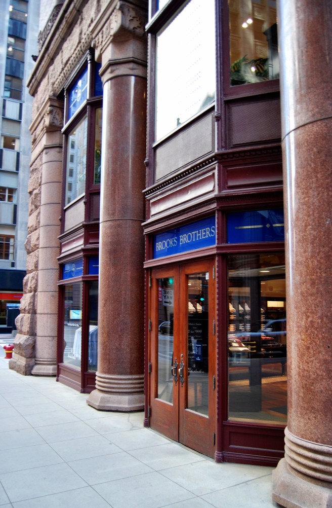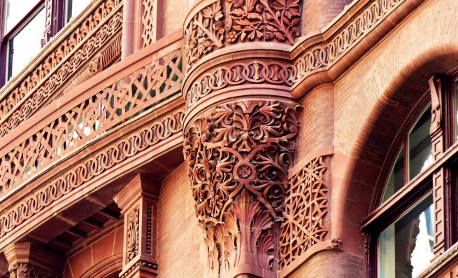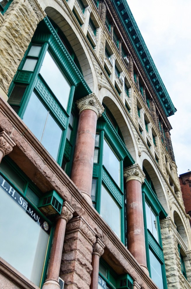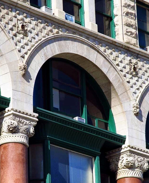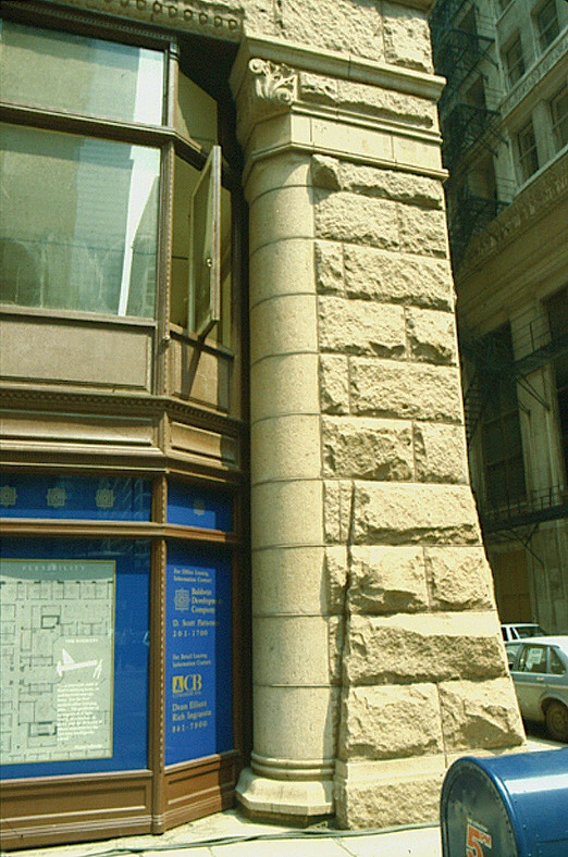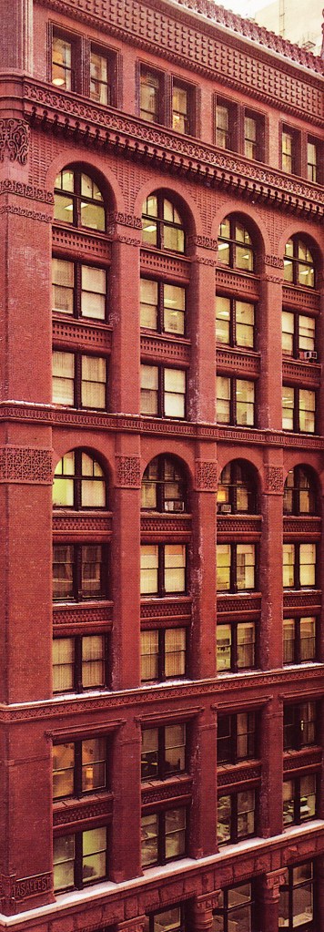 Root placed his columns within a rock-faced stone base that was framed by stone piers at the corners and a continuous rock-faced lintel at the third floor. The lintel was supported by the polished granite columns that appear to have been called into being from the rock-faced corner piers by a transition as masterfully detailed as if they had been carved in place by Michelangelo. As he had done in many of his transitional layers, Root used the material of the pier, but the shape of the column. (Truly, one of my all-time favorite details in the history of architecture.)