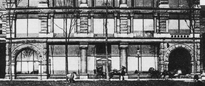 By this time, however, a building that was even more conspicuous in its Richardsonian detailing was already under construction immediately to the south of the Art Institute’s site along Michigan Avenue. Where else in a major city could one find the city’s Art Museum next to a new car showroom and assembly factory? The Studebaker Brothers, who manufactured carriages and wagons in South Bend, Indiana, had leased a showroom and sales office in Chicago since the end of the Civil War. In 1883, they had started acquiring the land along Michigan Avenue, just south of where the Art Institute would eventually locate, to erect their own building that would contain a showroom and a multistory factory to assemble the parts shipped from their factory in South Bend.