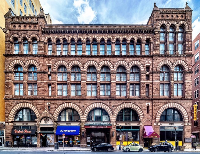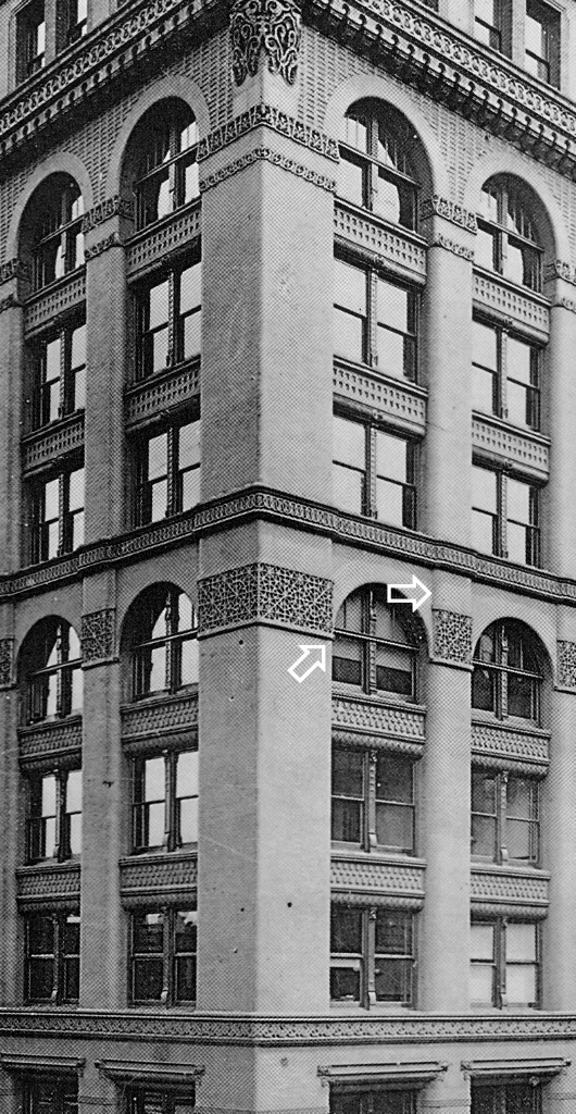 -third, either let the arcade at the fifth floor remain as is, terminating its “horizontal layer” and eliminate the corner pavilions above so that he upper three floors give a cleared reading of a layer with two floors with the top layer of one floor, OR…. continue the corner pavilions through the fifth floor as Richardson had done in the Cheney Building, rather than making them “disappear.” Beman did exactly that, eliminate the corner pavilions in his addition of 1898.