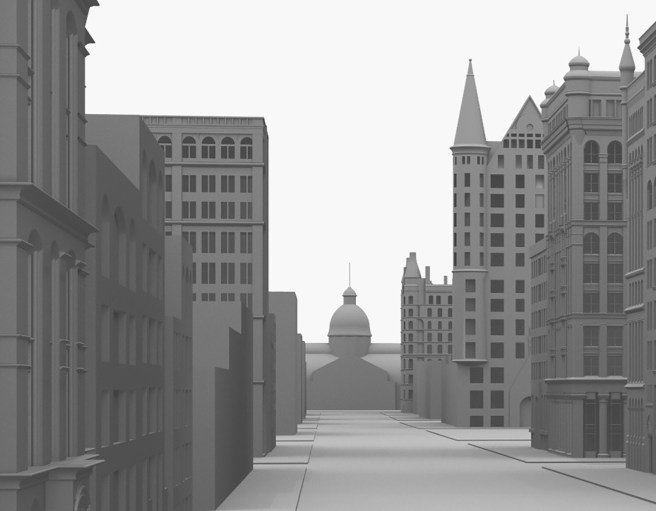 Reconstruction of Adams Street Looking East from Franklin, showing the portal at La Salle created between the Home Insurance Building at the left and the Rookery at the right. Root’s Burlington Building is at the far right, while his Insurance Exchange is at the far right. Cobb & Frost’s Owings Building, in back of the Rookery is three years in the future. (Digital image by David Burwinkel)