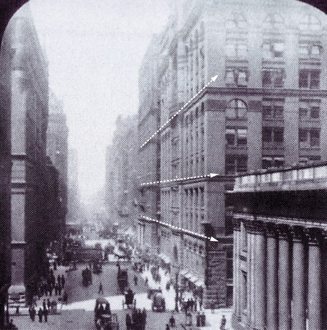 Above: Intersection of La Salle and Adams, looking north. Note how Root carried over the primary stringcourses of the Home Insurance Building (white lines) into the elevation of the Rookery. Root’s original ten-story design would have also reflected the upper floors of the Home Insurance, but the last-minute additional floor pushed its stringcourse out of alignment with that of the Home. (Merwood-Salisbury, Chicago 1890); Below: In this view you can appreciate how Root has aligned the Rookery’s major horizontal layers with those in the Home Insurance, as well as how the two skyscrapers side-by-side acted as a portal into the Adams Street corridor. Note the the tower of the Board of Trade has been removed. (urbanremainschicago.com)