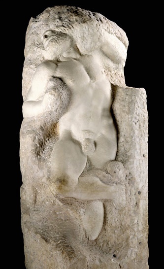 Michelangelo Buonarroti, The Awakening Slave, 1519. (Online); Burnham & Root, The Rookery. Detail of column carved from the corner pier. (Author image)