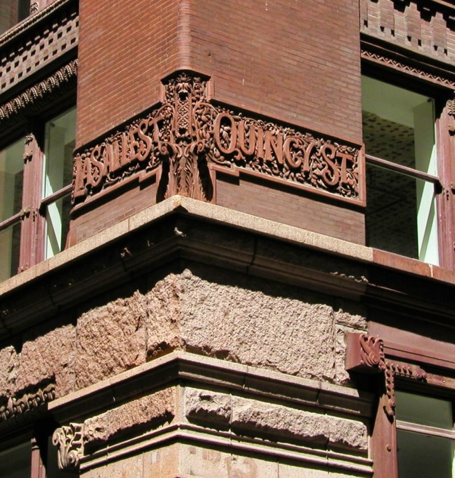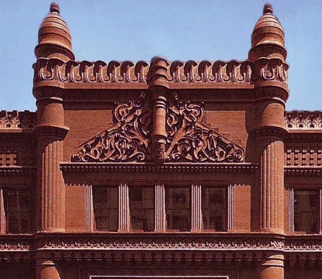 It is somewhat ironic, then, to find that Root, after having successfully eliminated the need for cut stone in his subterranean foundations, would now at this precise moment employ it as the dominant material in the exterior of one of his urban buildings (he had always used it in many of his residential projects). Many Root scholars cite this design as Root’s most “Richardsonian Romanesque” building. With the cut stone exterior and its large voussoired arcades and the Richardsonian gabled dormers on the Van Buren façade, its hard not to admit that Root had been influenced by Richardson’s winning design for the Cincinnati Chamber of Commerce. I consider it a divertimento, if you will; a precious little Celtic-etched jewel box allowing Root a break from the bevy of 10+ storied behemoths he was responsible for at this moment. I believe it is not coincidental that at just this precise moment, Richardson was also attempting to do his most “Rootian Commercial” design for Marshall Field’s wholesale store. It was, so to say, “Drawn pencils at twenty paces”…