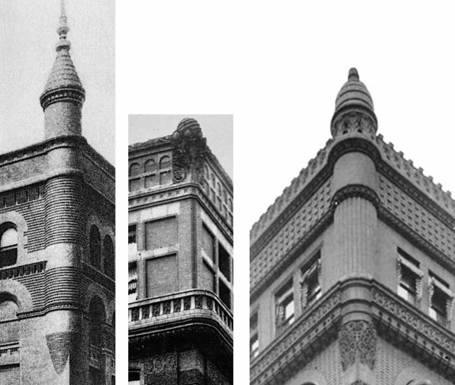 Left: First design detailed with a skewback to receive the arch in the seventh floor. While the arch is supported by the capital, the lintel above still would like to have that capital supporting it; Middle: In the two street fronts of the final design, the capital in the seventh floor supports neither the arch nor the lintel: it is floating; Right: The floating capital still appears in the alley elevations, but you can imagine here how this detail would have appeared if Root had not incorporated the second arcade.