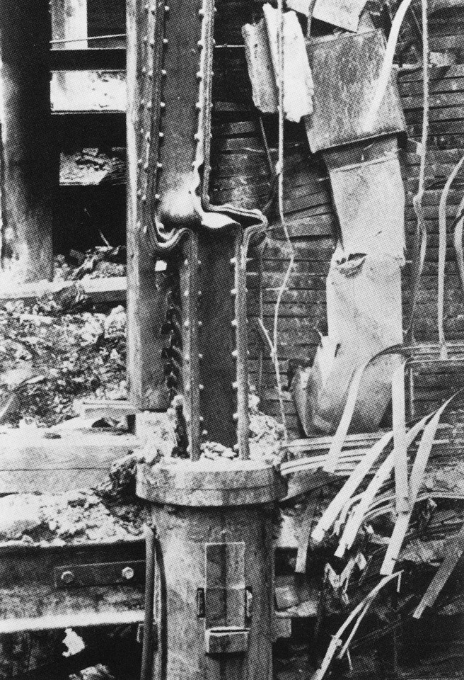 George Post, Equitable Building, New York, 1867. Left: Banking Hall as it appeared in 1889, showing the iron columns that support the walls above. (Landau, Post) Right: Interior iron structure exposed after a fire on January 9, 1912. The cast iron column is in the center bottom. Wrought iron girders frame into both sides of the column. Above the cast iron columns stands the built-up wrought iron column that supported the walls lining the lightcourt. (Landau, Rise of New York Skyscraper)