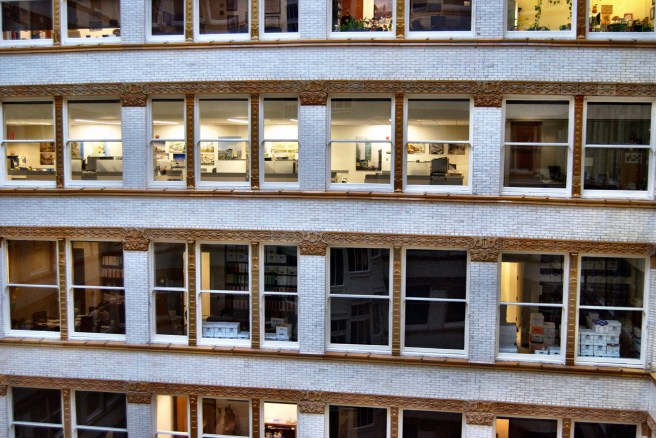 Drafting Room, Burnham & Root. You can look into the light court. Do not be confused by the line of windows across the way that are in a floor higher than the top floor: these are the windows for the attic. (urbanremainschicago.com)