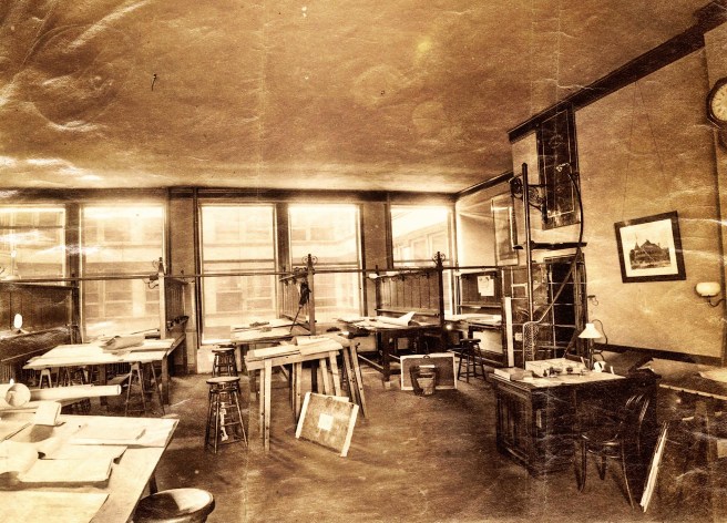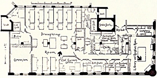 The drafting room was well-lighted because they took out the corridor on this side so that the drafting room opened from the glass on the south face to the north-facing glass lining the light court. There would always be uniform northern daylight for the draftsmen along the light court because they were on the top floor (no shadow).