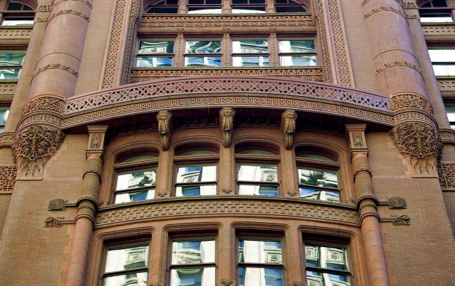 Burnham & Root, Rialto Building. Detail of base showing two-story oriel windows.