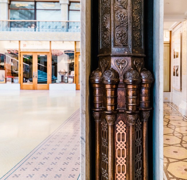 One of the original iron columns that was encased by Wright in the 1905 remodeling. (therookerybuilding.com)