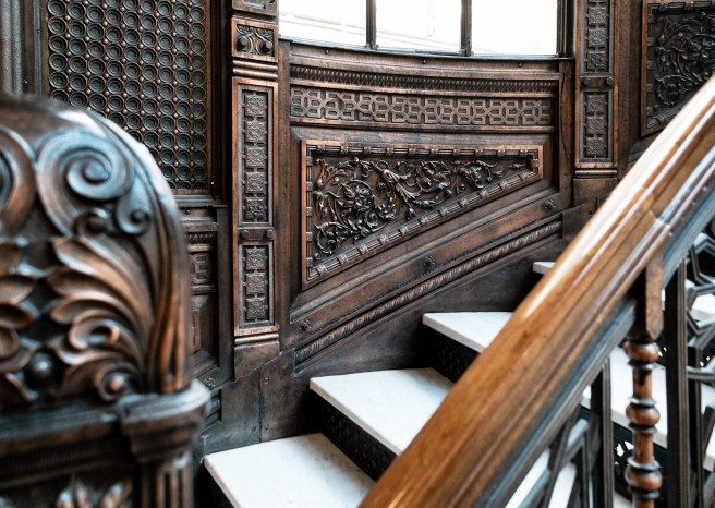 He pulled a visitor across the ground floor of the courtyard by placing a monumental stair to the mezzanine directly opposite from where one had entered that was flanked by electroliers that outshone even those he had designed for the Phoenix. Walking to the stair, one’s head moved upward, looking through the crystal skylight. The visitor caught a glimpse of the light court stair tower above and then saw Root’s piece d’ resistance: a floating set of stairs that would actually take one through the skylight and into the stair tower of the light court.