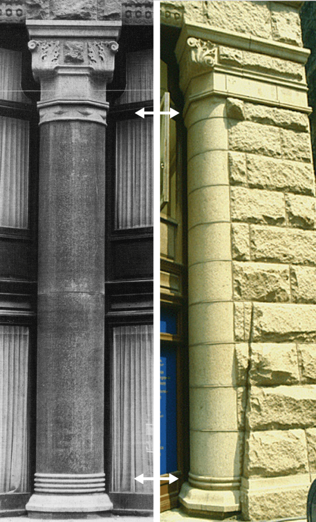 Comparison of the Home Insurance base with the base of the Rookery. Where Jenney broke his two-story base into two one-story layers with a continuous band of stone (arrow) at the second floor, Root detailed his base as a two-story layer articulated by the two-story oriel windows and granite columns. The Home Insurance was known for its four granite columns at the La Salle entrance (there were none at its Adams entrance). Root used ten of the same-sized columns along his base: six on La Salle and four on Adams.