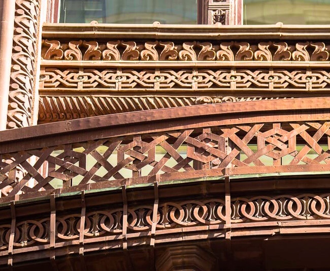 There is one more aspect of the elevations we must examine: the use of one of the first all iron and glass curtain walls on the first two floors of the alley elevations. The cast iron front had been used since Bogardus invented it in 1848. The difference between the cast iron front and the Rookery’s alley elevations was that the glass was located between the iron columns in a cast iron front, while in the Rookery, the glass (curtain) wall was located in front of the iron columns.