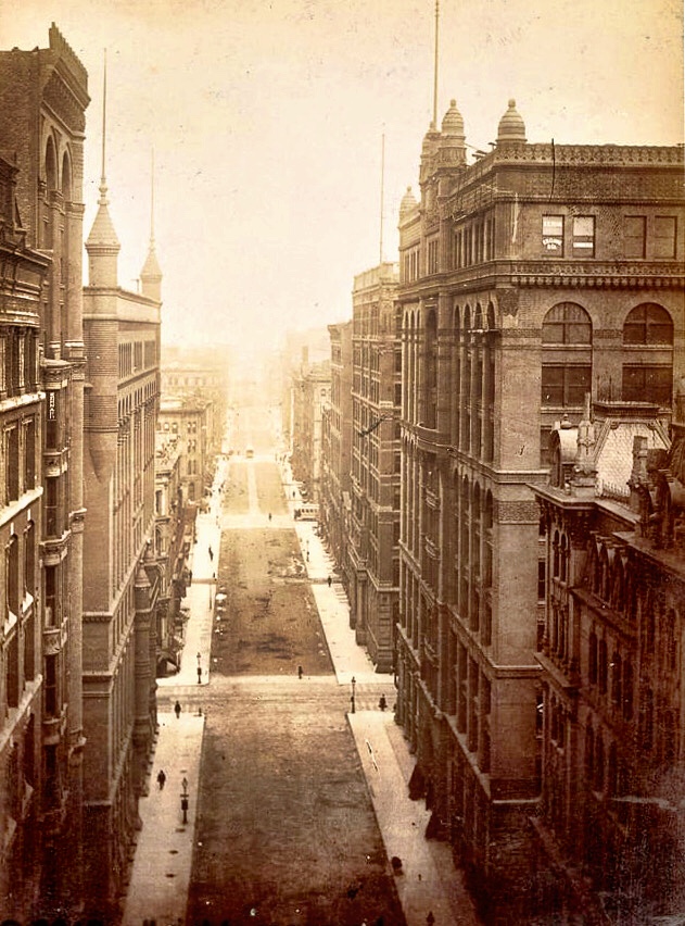 Above: Intersection of La Salle and Adams, looking south. The Rookery (left) and the Insurance Exchange (right) as the portal to the Board of Trade district. The entrance of the Home Insurance Building with its famous columns is in the left front. The Maller’s Building with its corner turret of stacked vaults is in back of the Insurance Exchange. (Merwood-Salisbury, Chicago 1890); Below: Intersection of La Salle and Adams, looking north. On the left: the Gaff, the Maller, the Insurance Exchange, the Marshall Field dormant excavation; on the right: the Grand Pacific Hotel, the Rookery (note how the additional story in the Rookery lifted its roof over the Home Insurance across the street (photo taken prior to when the addition floors were added). (urbanremainschicago.com)
