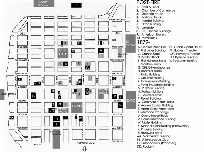 I want to review Adler’s earlier designs for these loft buildings (skyscrapers would have to wait until 1890) simply to establish the firm’s development in designing the elevation of a business building. Following Adler’s design for the Central Music Hall in 1879, Adler had been hired by John Borden and his son William (using the returns of their investment in silver mining in Colorado during the late 1870s) to design a six-story office building. Adler, as had Jenney in the First Leiter Building, chose to emulate the “structural” elevation of expressed piers and spandrels (but not its triple window) so successfully employed two years earlier in Cincinnati by James McLaughlin in the Shillito’s department store.