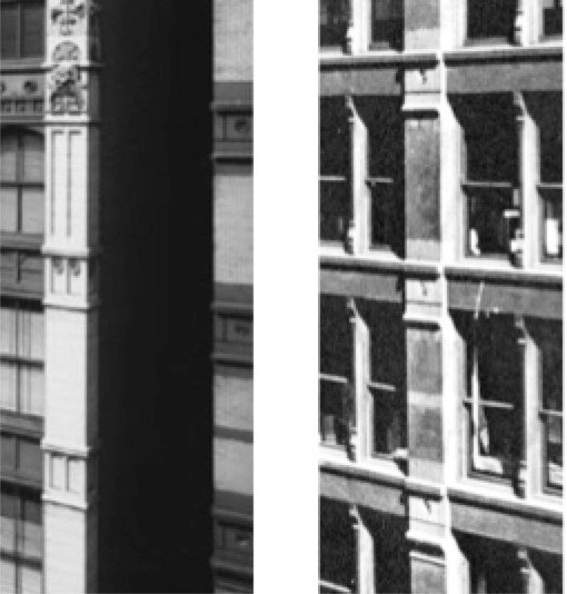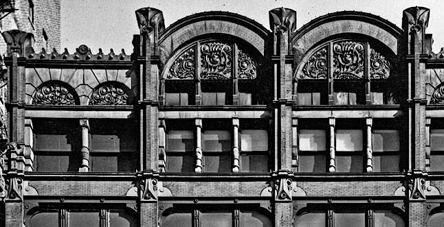 For the five-story Jewelers’ Building, they changed the structure from two bays to a central bay with “side aisles.” This was accomplished by splitting the central column into two pieces and spreading them apart to create the central bay. This had the effect of locating a column closer to each party wall, for which they simplified the elevation by combining the end column and this new column into a corner pavilion with flush spandrels and a cornice to create the equivalent of a structural bay/pavilion that they first employed in the Jewelers’ Building, again a simple storefront. Bay/pavilions with a single window were placed at each corner and once again triple-paned windows infilled the rest of the elevation. A shallow segmental arch spanned the opening between the two pavilions, whose surface was detailed in the same plane of the pavilions, thereby unifying the two bays at the cornice into one frontal plane, albeit the building’s structural polychromy somewhat negated this effect. (One could project the image of a triumphal arch in this design.) This was the building where seemingly Sullivan was able to restrain his propensity to let his pencil run wild (budget constraints?), and his ornament was finally subordinated to the overall massing of the building.