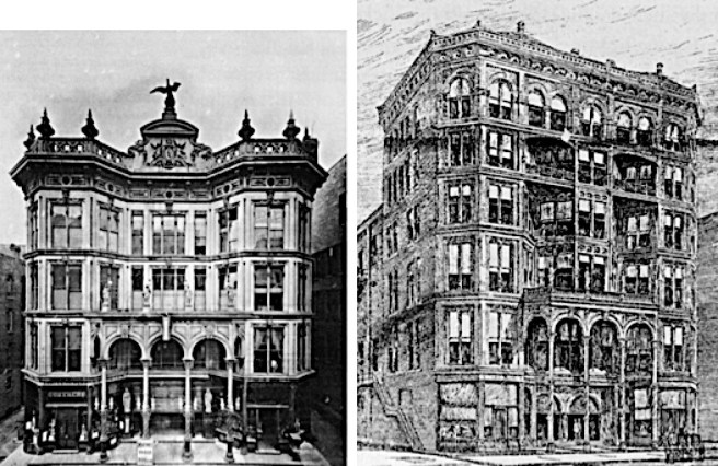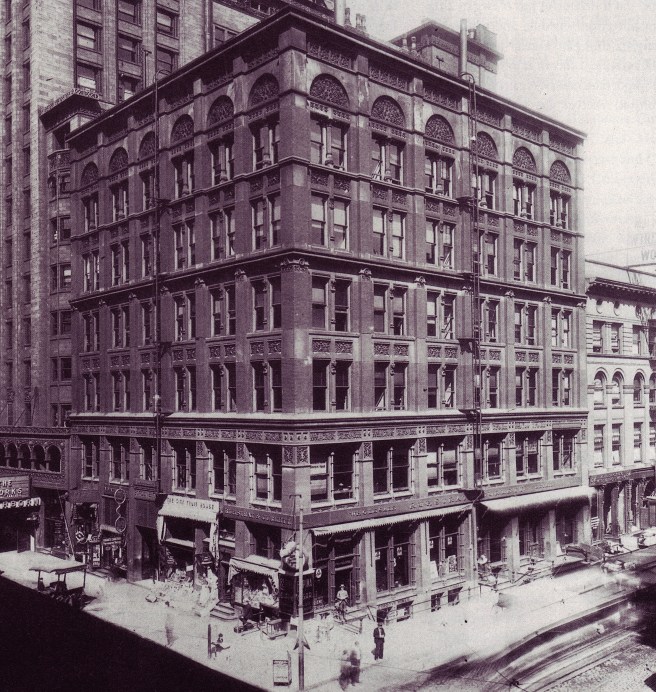 The firm then experienced a two-year drought in business buildings from 1882-84 while their bread and butter, residential and industrial buildings (see Morrison for a list) kept it busy. During this period, Sullivan’s close friend, the itinerant John Edelmann, whom he had first befriended in Jenney’s office in 1874 and who was responsible for bringing Sullivan back from Paris in 1875 with the commission to design the murals in Moody’s church, had once again returned to Chicago. Menocal credited the change in Sullivan’s design aesthetic manifested in the following trio of buildings employing Egyptian and Pre-Columbian (a naive attempt at an “American” architecture?) detailing, to the almost Svengali-influence that Edelmann had on Sullivan. Sullivan was involved in the design of these next three buildings during 1884, although their construction was spread over the end of 1884 and the spring of 1885.