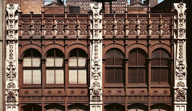 While the interior of McVicker’s was based on one “consistent scheme,” the exterior of the renovated theater still exhibited Adler & Sullivan’s propensity to over activate their elevations, as they had done with their small business buildings that we have already reviewed (Sec. 7.12.) that were contemporary with the McVicker’s design, although it wasn’t constructed until 1885. Just imagine being Dankmar Adler in May 1883, having just agreed to Sullivan’s becoming an equal partner… especially after Sullivan’s theater interior designs were generating rave reviews in the local press. It would have been very hard to say “not yet” to the precocious designer’s desire to move into designing the exteriors of the firm’s new commissions. After looking at Sullivan’s early exterior designs, especially the Ryerson building, you may wonder “was the architect who designed this agglomeration of seemingly unrelated details the same genius who produced the glorious detailing in the Grand Opera House and Hooley’s Theater?” I can only offer my insight gained after having had over 2000 architecture or interior design students in my design studios during my forty-plus years at the University of Cincinnati, that not only does every student comes to the drafting, scratch that, the studio table with a different set of skills, but also the design of a building’s interior is quite different from the design of a building’s exterior. By no means am I trying to infer one is harder than the other; I am simply stating that these two design problems have their own problems to solve, and while related, are no means solved with a set of interchangeable skills. The young Sullivan was a perfect example. While he was a wiz at ornament and interior design, his young talents in designing the exterior of a building left much to learn.