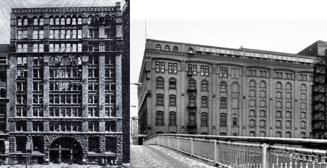 The design of the second of the trio, the six-story loft building for Anton Troescher brought a return of “repose” at least in the lower five floors. Its site, 15 S. Market (Wacker) located on the east side of S. Water between Madison and Monroe Streets, was wide enough to allow four (even number) structural bays. The elevation was well-ordered into a brownstone arcaded base of shallow elliptical arches suporting a four-story body of continuous brick piers and triple windows.