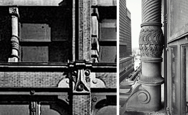 Like he had done in the Rothschild Building, Sullivan increased the quantity in each of the top two floors. In the fifth floor, not only did the infamous “totem” backets in the Ryerson make a reappearance, but they were also mirrored-imaged in the spandrel above.