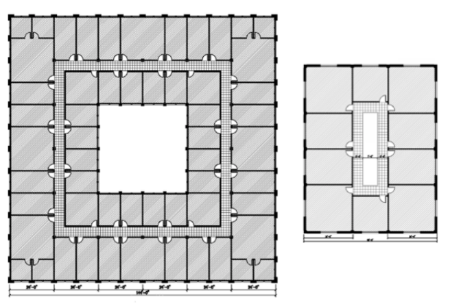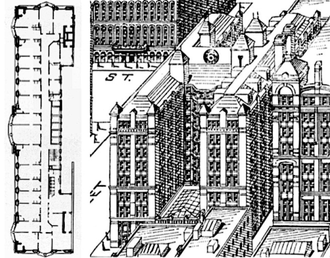 Most likely, the Rookery was no exception to the office’s standard procedures. I have already reviewed how 19th century architects planned a building around daylight requirements (see Sec. 2.7-11). Hence, Burnham’s preliminary plan studies for the site, surrounded on all four sides by a street (i.e., immediate daylight) would have revealed a startling fact: unlike all of their previous skyscrapers, the site’s 168′ x 178′ dimensions would free them from their conventional scheme of a thin slab of a double-loaded corridor (Insurance Exchange and the Phoenix).