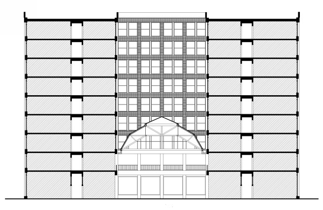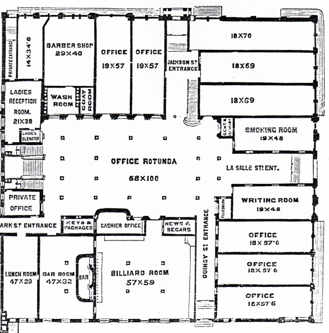 This would have resulted in a huge waste of floor area ($$) in the resulting interior atrium. More than likely Burnham would have tried all of these schemes just to make sure that what he probably felt all along, that is, that the double-loaded corridor plan that Boyington had employed fifteen years earlier in the Grand Pacific Hotel, for a site with the same overall dimensions just across Quincy Street, would be the most efficient use of the site.