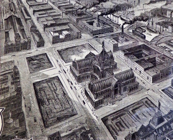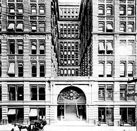 5. In urban design/structure, investors of La Salle Street (the Board of Trade gang) overran the plans of those invested in Dearborn, meaning primarily Peter and Shepherd Brooks. The Brookses had inside information about the planned location of the new C&WI station to be built in line with Dearborn, but their plans were frustrated by the La Salle group’s “clout” with City Hall, that slowed the construction of the extension of Dearborn south of Monroe for over two years. During this same time, Adams Street emerged as the major east-west corridor, running from Union Station at the river to the Exposition Center at Michigan Avenue. Adams was a natural simply because the post-fire City Hall, the “Rookery” sat the corner of Adams and La Salle, and the site for the new, post-fire Federal Government Building had been moved two blocks farther south to Dearborn and Adams. The buildings erected on Adams during this period included: the Pullman, the Revell, the Home Insurance, the Insurance Exchange, the Burlington, Field’s Wholesale Store, and, of course, the Rookery.