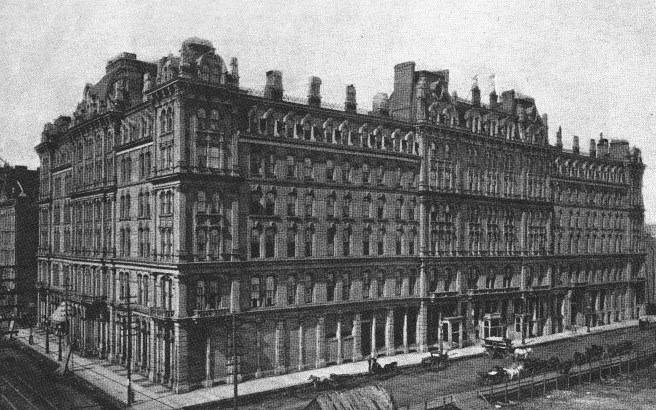 Burnham & Root, Midland Hotel. This photo was taken after the entry portico, the corner turrets, and the chimneys were removed in a “modernization.” Note how open the ground floor was. (Online)
