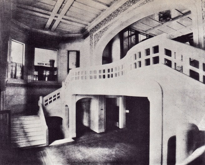 Burnham & Root, Midland Hotel. Lobby. Note how Root has cantilevered a lookout from the elevator lobby at the second floor on the left that more than likely corresponds to where the spiral stair begins. (Online)