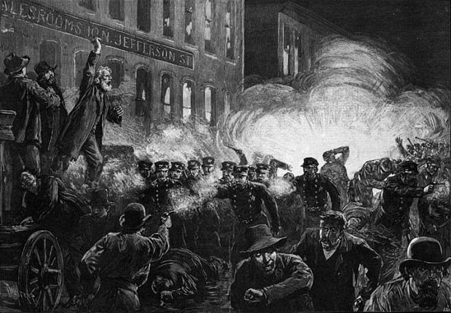 Unfortunately, this left a power vacuum that was willingly filled by those in the police force who were spoiling for another fight, and in less than 20 minutes later, a police column was spotted by the crowd, moving at double-time up Des Plaines towards the speaker. The commander yelled halt to his men and demanded that the speaker cease immediately. The speaker replied that they were acting peaceably, and as the commander began to repeat his demand, an unknown assailant in the crowd threw a lighted bomb into the middle of the police formation. In the midst of the confusion caused by the explosion, the police opened fire, wounding not only many of the crowd, but also a number of their own. The final recorded death toll included eight policemen, at least four bystanders, seven of the eight anarchists who were rounded up in the ensuing dragnet and found guilty of murder, and the eight-hour movement (at least for many more years to come).