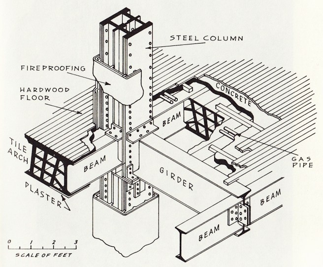 “Chicago Construction.” Hollow fireclay segmental flat arches span between iron/steel beams that are protected from fire either by the floor tiles or by added fireclay casings, as are the iron columns. This is a drawing of a more developed system employing steel columns from the early 1890s. (Condit, Chicago School)