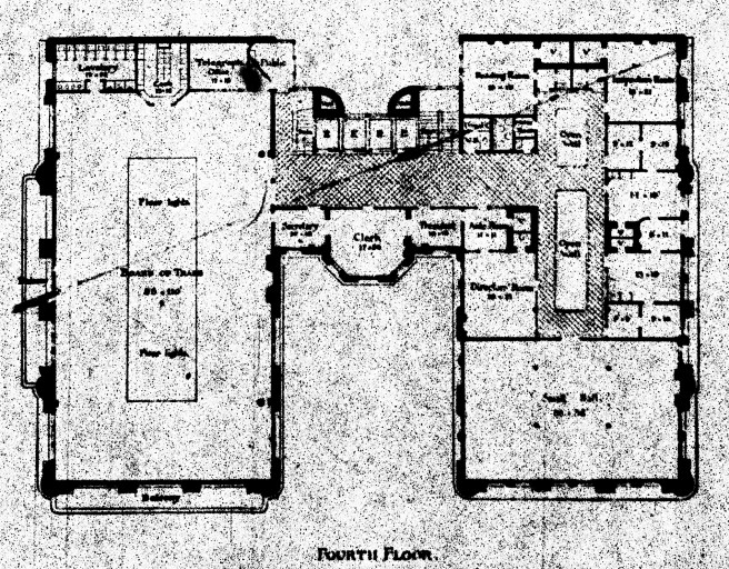 At the seventh floor, Root cantilevered a continuous walkway beyond the exterior wall as well as the stair in the oriel. Until a plan of this floor is located, one can only surmise that the purpose of this walkway was to provide access for the waiters serving the banquet hall. As construction neared completion, unfortunately, two trusses over the banquet hall on the top floor collapsed on March 1, 1888, killing one worker that led to a Coroner’s inquest.
