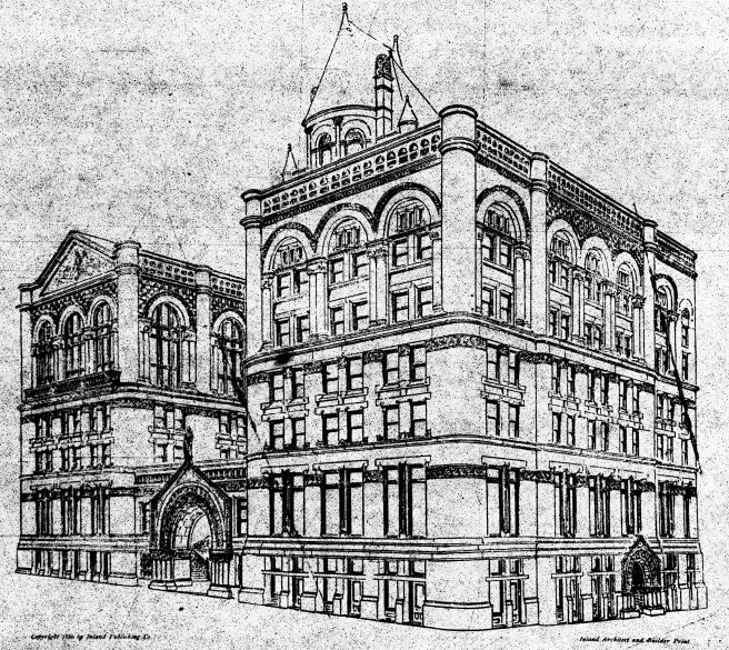 In 1888 E. Townsend Mix, (we last mentioned Mix in Sec. 3.7, where he had been the first architect to use P. B. Wight’s new terra cotta system in Milwaukee’s Mitchell Building in 1875) designed the 12-story Northwestern Guaranty Loan Building, the highlight of which was its 12-story atrium (and Chicago thought the just-completed Rookery was something special…). Unfortunately for the building’s owners, who wanted the tallest building outside of New York, the Pioneer Press in St. Paul hired S.S. Beman to design its 13-story building, This forced Mix to add a 40′ tall pavilion to the Northwestern Building, topping it off at 220,’ taller than any building in Chicago except the tower of the Board of Trade (this addition forced the owners of Chicago’s Auditorium to add two floors to its tower, increasing its height to 225′). Nonetheless, no Chicago building in 1888 had a 12-story atrium. Mix’s building had a 12-story atrium, and the atrium in Beman’s Pioneer Press was 13 stories high.