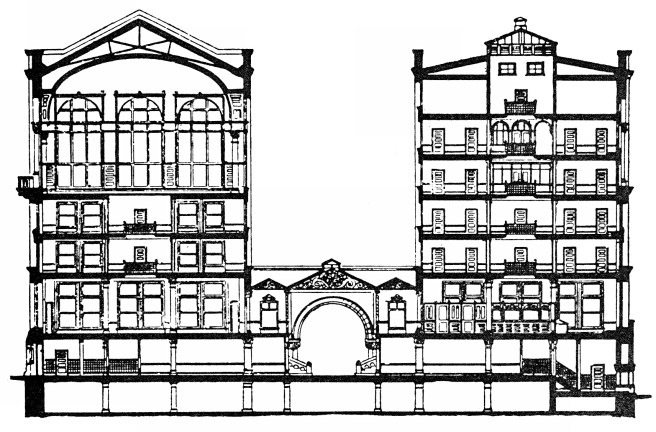 Burnham & Root, Midland Hotel. South side, showing the light court and the skylight over the ground floor. (Online)