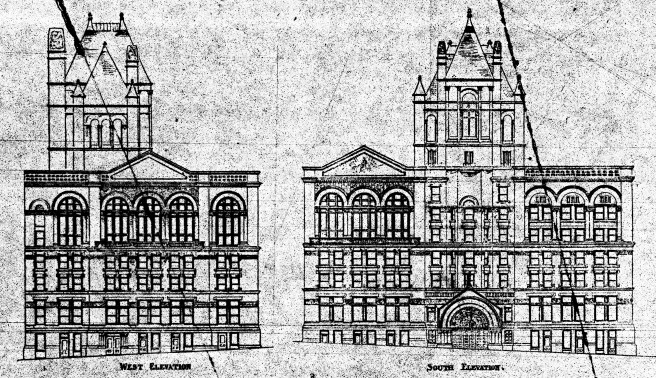 “This competitor began a study of the problem by laying out all plans he could devise as feasible for such a building and lot. Their value as to exterior light and air was then compared; and the one herewith submitted giving the best results, was therefore chosen. It depends but little on interior courts, and opens well to the south, from whence comes most of the sunshine and the summer breezes… Following out this scheme of looking first and only to practical utility in the consideration of all the main questions, the outside of this building is to be almost entirely of red brick and red semi-glazed terra-cotta.