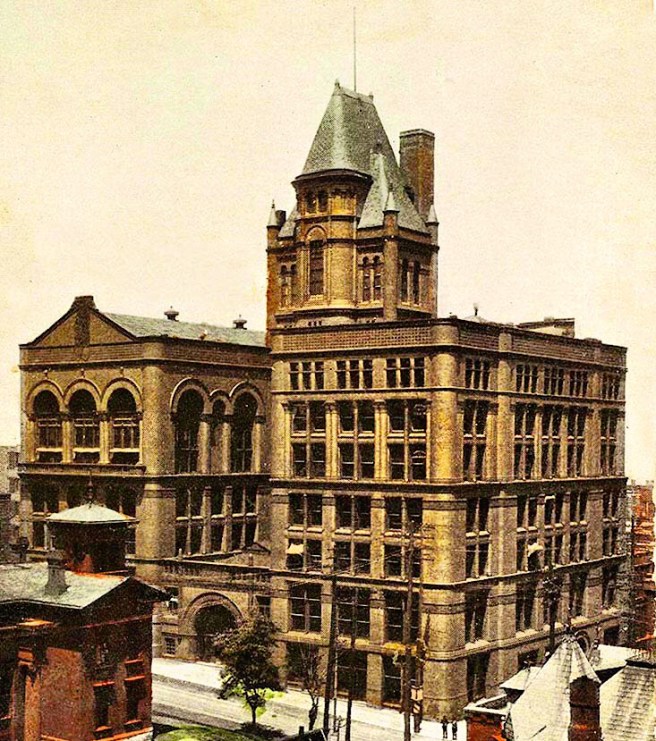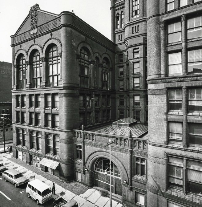 These two great architects had learned some “new tricks” from each other’s buildings. Root had had an immediate impact on Richardson’s work. This was first seen in Richardson’s desire to design the Field Store as a red brick box, inspired by Root’s Burlington Building standing across the street from the Field Store, rather than using his characteristic stone walls topped with a high-profile roof. Although Field denied him this opportunity, Richardson succeeded in realizing the red brick box in his next (and last) two large urban commissions. In December 1885, he was commissioned to design an armory in Detroit as a memorial to John J. Bagley, Michigan’s reform-minded governor who had died from tuberculosis in 1881. The degree of openness that Richardson achieved in the brick streetfront was unknown in his exteriors prior to his trip to Chicago. This was accomplished with a three span arcade that rose for the first three stories. He had employed a three-storied arcade in the courtyard elevation of the Allegheny County Courthouse, but had only opened up the upper-most story as a clerestory for the courtrooms. When Richardson arrived in Chicago he found Root had detailed triple windows under such an arcade in both the McCormick Building and well as the then under-construction Art Institute.