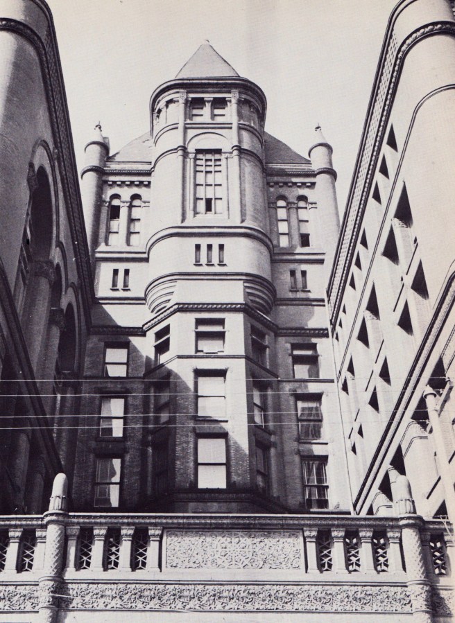 Look carefully at these two apartment buildings: how did Root eliminate the corners, à la Richardson’s Ames Building? Of course, he put a stack of bay windows at the corner, as Richardson had done in the tower of the Allegheny County Courthouse, thereby not only eliminating the corner, but implying that the building had been wrapped with one continuous surface. I could also point to the Maller Building standing diagonally across from the site of the Rookery as a precedent with the exception that J.J. Flanders had detailed this masonry cylinder as a solid.