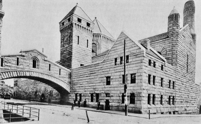 In Sec. 11. 3. I noted the unbroken surface of the upper two floors lining the courtyard in the Allegheny Courthouse. In 1884, this same approach appeared in his next stone design after the Pittsburgh jail, the Immanuel Baptist Church in Newton, MA.
