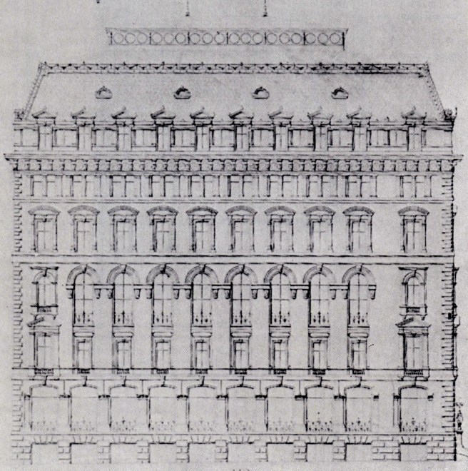 Richardson started the Field design where he had left off with the Ames Store, using the layered arcade motif with a decreasing geometric progression in the spacing of the windows of 1:2:4. Here we confront another architectural history legend. The story varies from writers claiming that Richardson’s progressive arcades unleashed a number of copycat designs in Chicago as the perfect solution to the skyscraper’s elevation (Sullivan did appropriate it for the Auditorium but it is not a skyscraper) to those who claim the Field Store was the first use of layered arcades in a diminishing progression even though historians have traced this motif back in American buildings (see Sec. 5.1) to Detlef Lienau’s 1864 design of the Noel and Saurel Building in New York (even in Richardson’s own work we find him using this motif as early as 1867 in his entry for the Equitable Building competition).