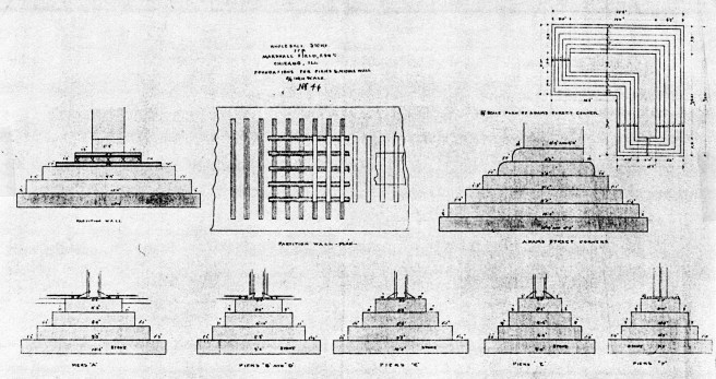 Finally, Richardson had to bring this structure to the ground via a foundation system, one the mistakes he had made in the earlier American Express Building. Root’s biographer, Harriet Monroe, reported that Richardson had visited Root’s office during one of his trips to Chicago, ostensibly to query Root about the design of the foundations for the Field Store. In reality, professional courtesy of the time would have dictated that Root, the city’s leading architect, invite the famous Richardson to visit the office. If the meeting actually took place, it more than likely occurred during Richardson’s stay in October 1885, as the Field project was still in secret gestation during Richardson’s earlier visit in May to discuss the Glessner’s house. Although his construction drawings reveal that Richardson had incorporated Root’s relatively new technique of using iron rails in only the footings that supported the interior fire walls, it is apparent that Richardson had learned little from this talk with Root, or for that matter, his prior experience twelve years earlier with the problematic settlement in the American Express Building, for he still designed the stepped stone footings in the traditional Eastern way, either ignorant of or choosing to ignore Baumann’s theory for uniformly-stressed foundations. This technical oversight would once again plague Richardson’s second building in Chicago’s Loop, but unfortunately, it would take more time for the mistake to manifest itself in physical distress than it did in the first building, so that it could not be as easily remedied as had been the American Express Building by Peter Wight’s redesign of its foundation and front elevation. The heavier-loaded foundations of the exterior wall settled at a greater rate than did the interior pad footings under the columns, that resulted in the floors sloping to the lower, exterior walls (one can experience the same phenomenon in the floors of the side balconies in the Auditorium).